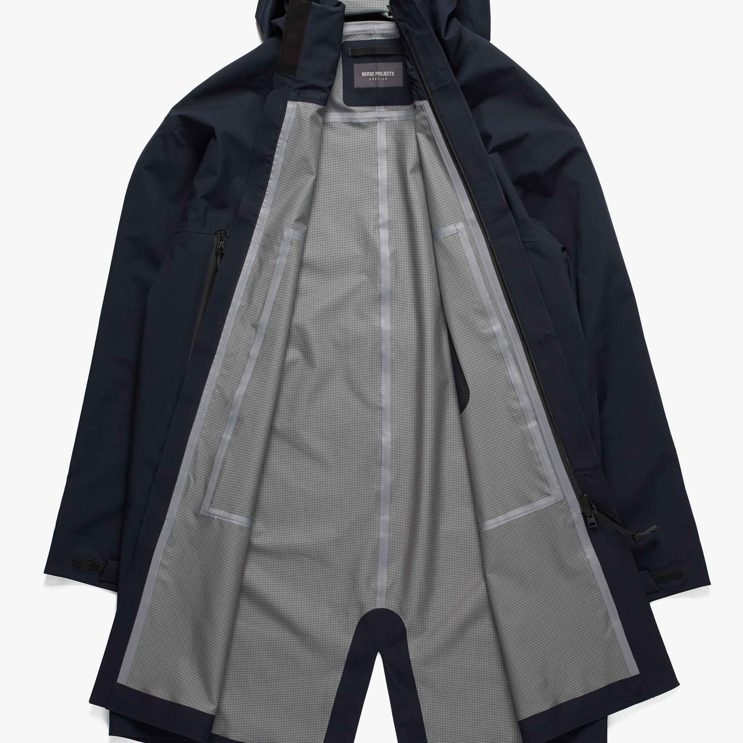 This garment uses proprietary Norse Projects technology. Combining lightness and performance. Constructed in a light weight plain weave face, using recycled polyester. With a recycled grid structure backer and PFC free DWR. The garment is fully seam taped to ensure waterproofness.