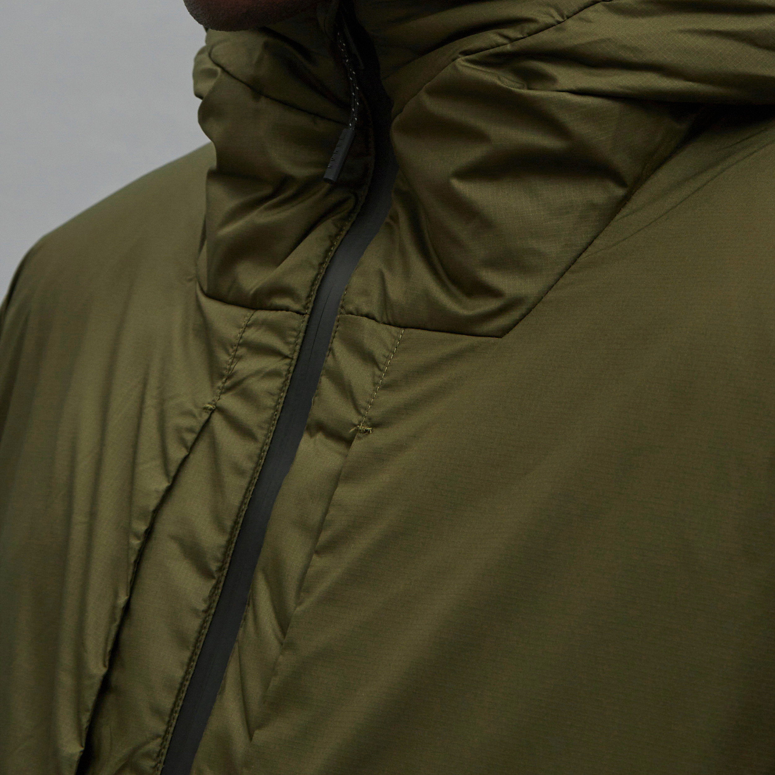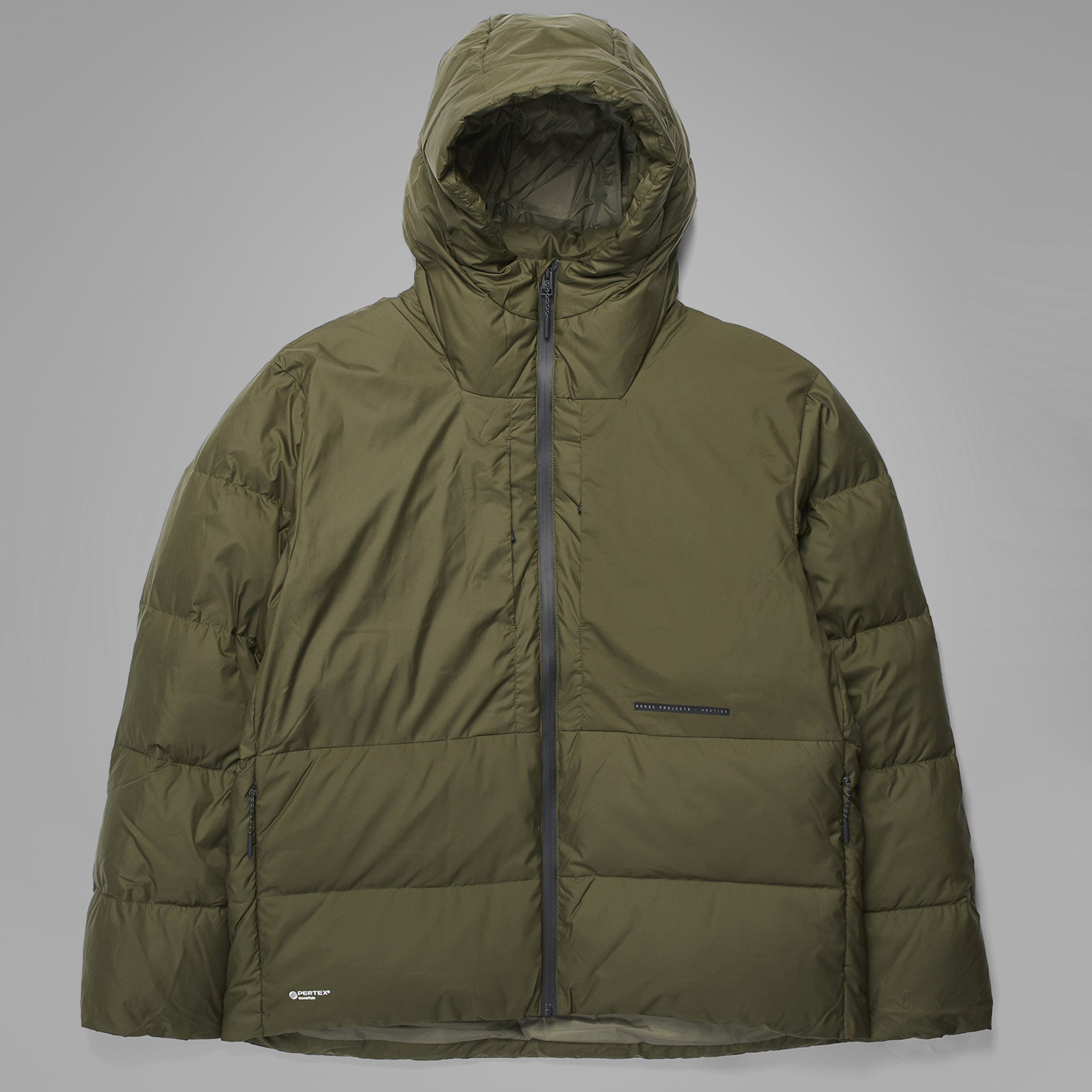 A short hooded down jacket featuring Pertex Quantum technology; a technical fabric that uses a tightly woven structure to provide a light and soft windproof fabric that allows insulation to fully loft. This construction is designed to trap still air and improve the efficiency of insulation. This textile is 50% recycled and finished with a PFC free DWR finish that sheds light rain and snow to provide additional protection. Features include a double front chest pockets, and a water repellent PU coated zip front.
