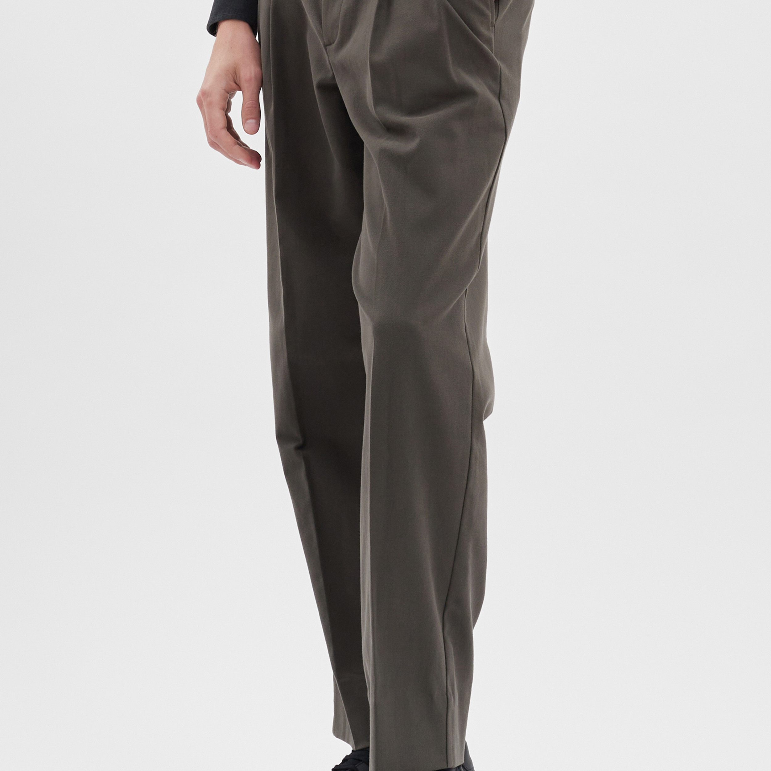 A relaxed fitting tailored pant, cut with a loose leg and double pleats at the front. Constructed in a cotton wool blend fabric with a twill structure, that has a mid-weight drape. Finished with an internal half lining, zip fly and flap pocket details at the back.