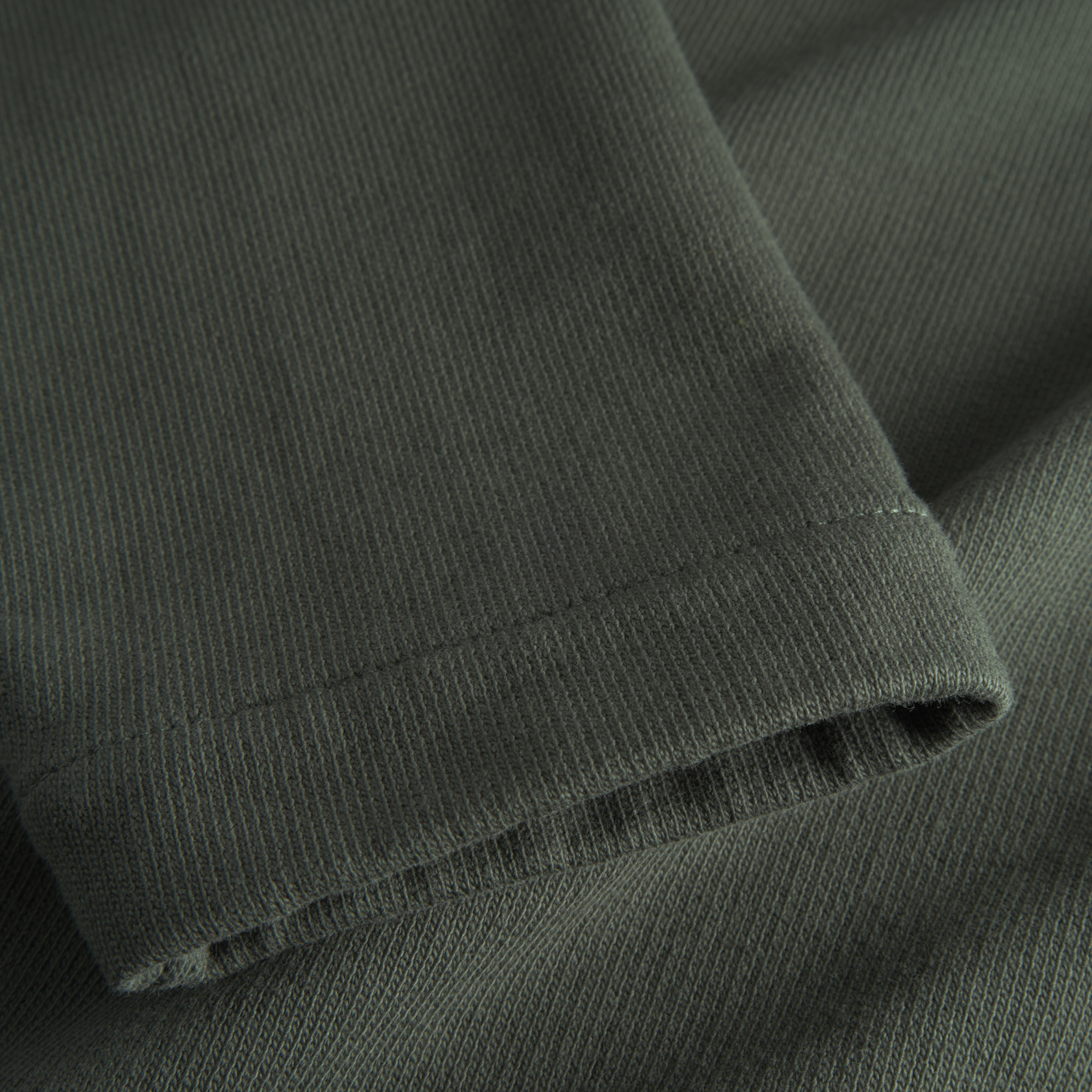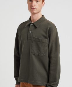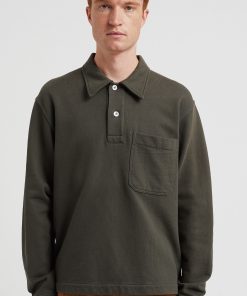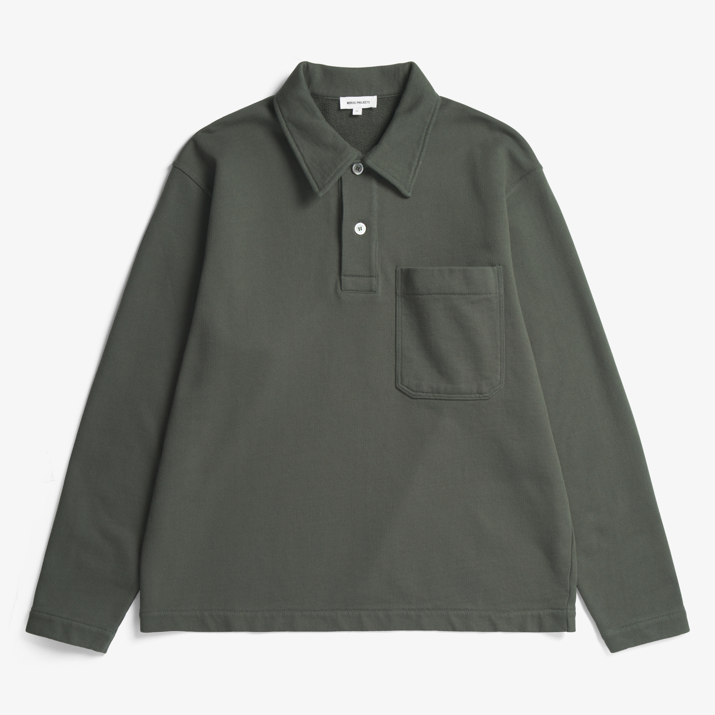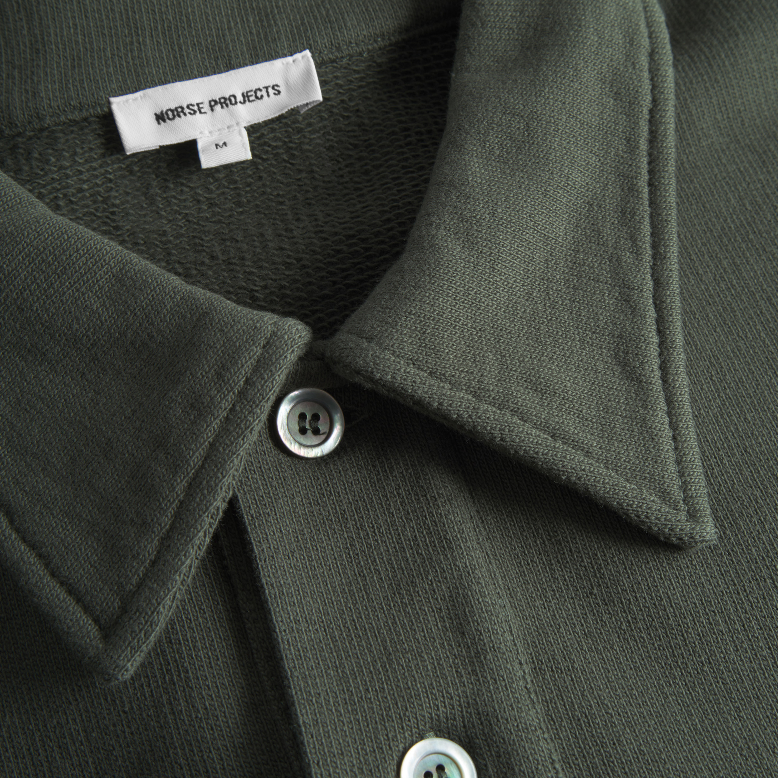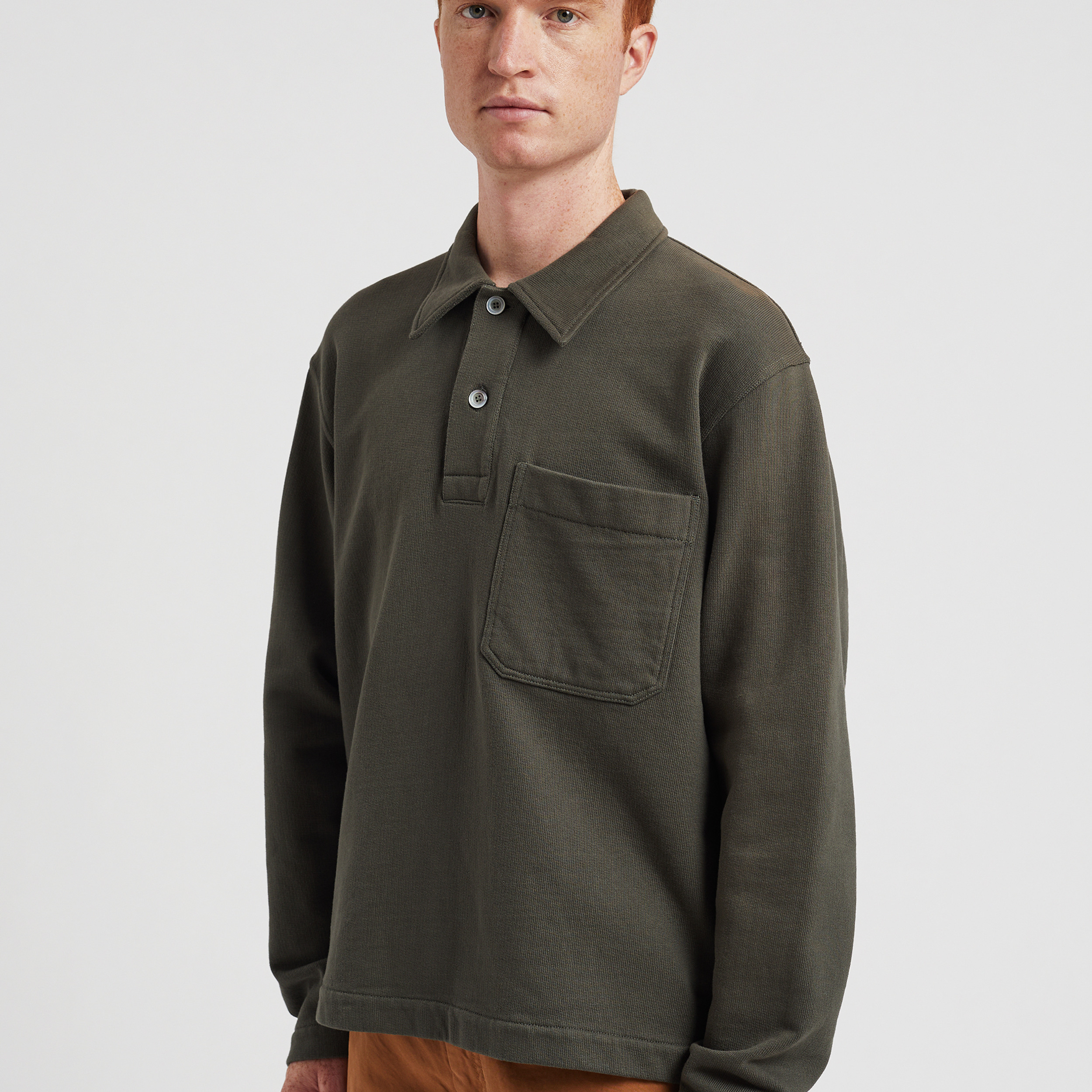 A relaxed fitting quarter placket sweatshirt with set-in sleeves and cut in an organic loopback cotton fleece. The style features a collar, a placket with rivershell buttons and a chest pocket. Finished with a branded hang loop at the back neck.