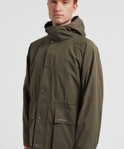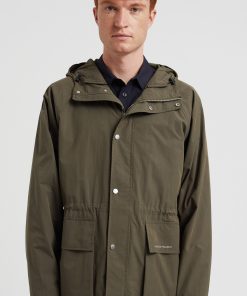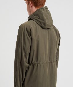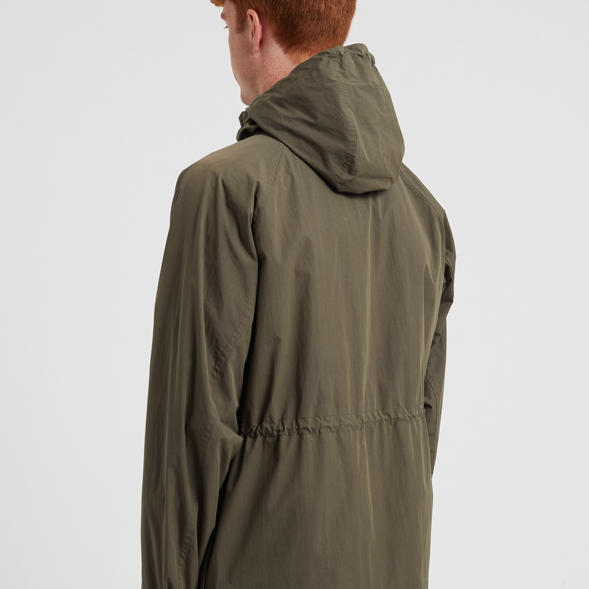 A hooded windbreaker style, constructed from a cotton nylon water repellent poplin. The windbreaker is designed with a raglan sleeve, and features a zip and snap front closure. It is finished with adjustable elastic back hem and zip pockets.