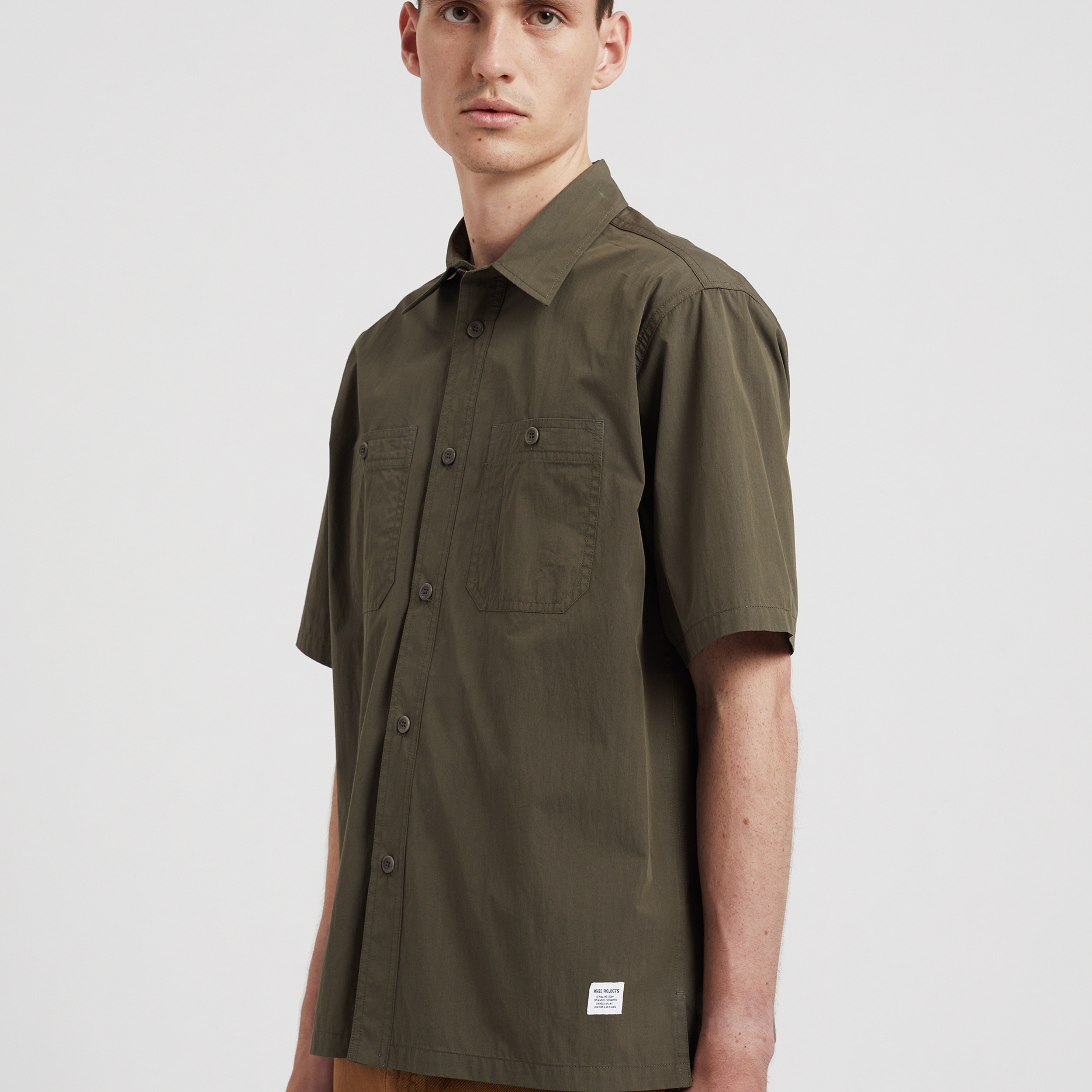 A regular fit short sleeve shirt, cut in a light and crisp cotton nylon poplin cloth. The nylon adds durability, whilst the cotton provides a natural handfeel. Features a two chest pocket construction. This shirt is finished with corozo buttons.