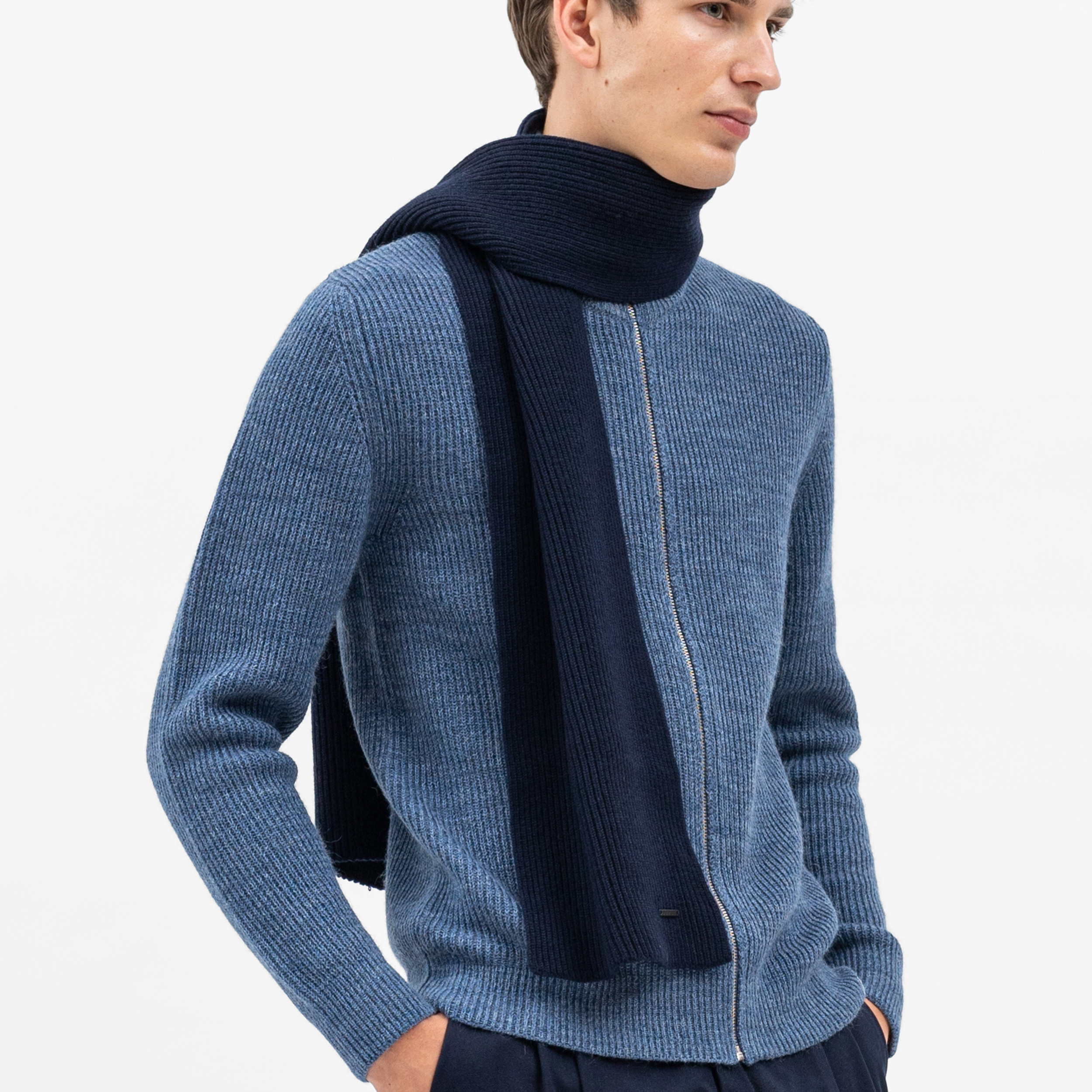 A rib scarf knitted in extrafine merino wool in a full cardigan stitch. This soft and luxurious yarn is breathable and thermoregulating and makes the garment suitable for daily wear all year around.