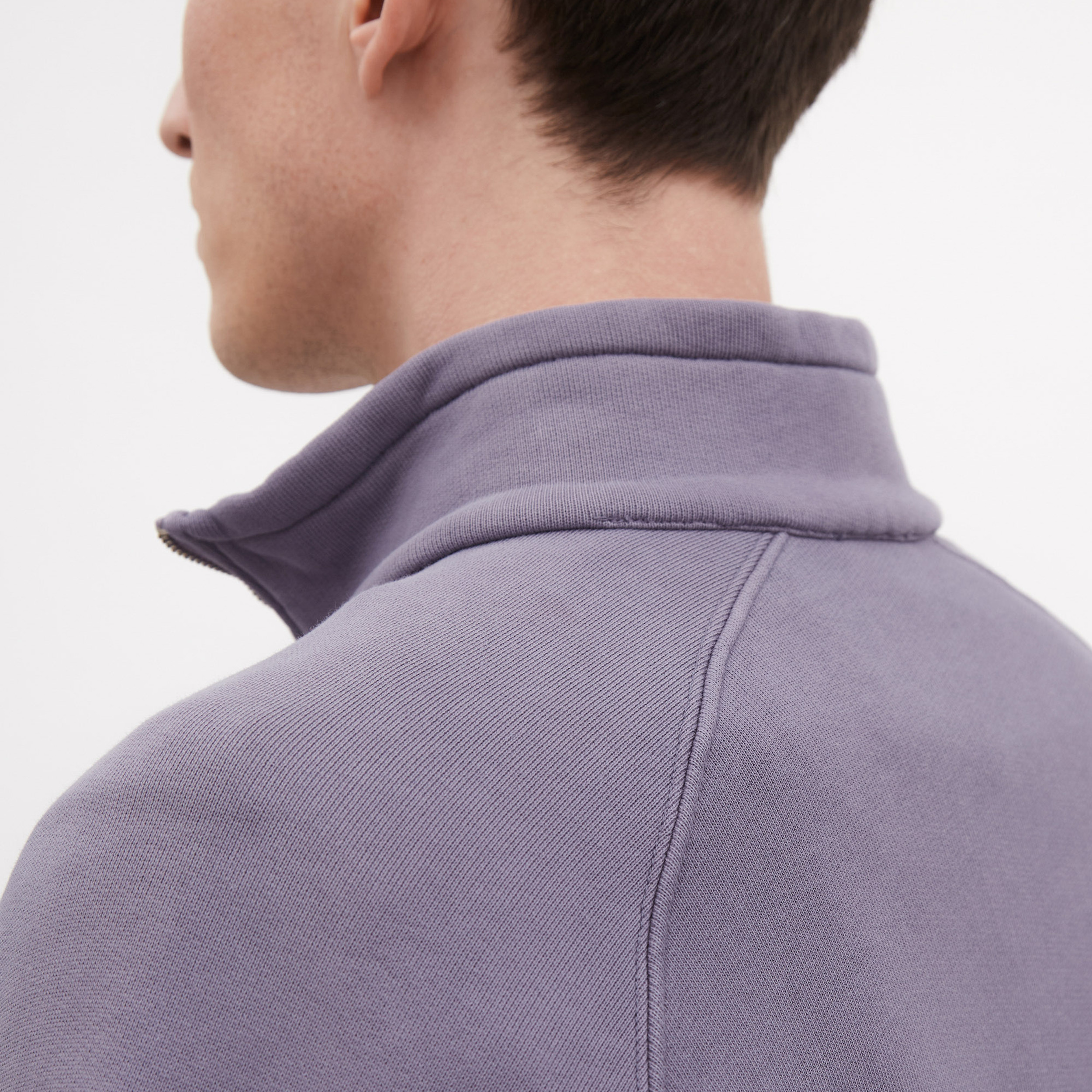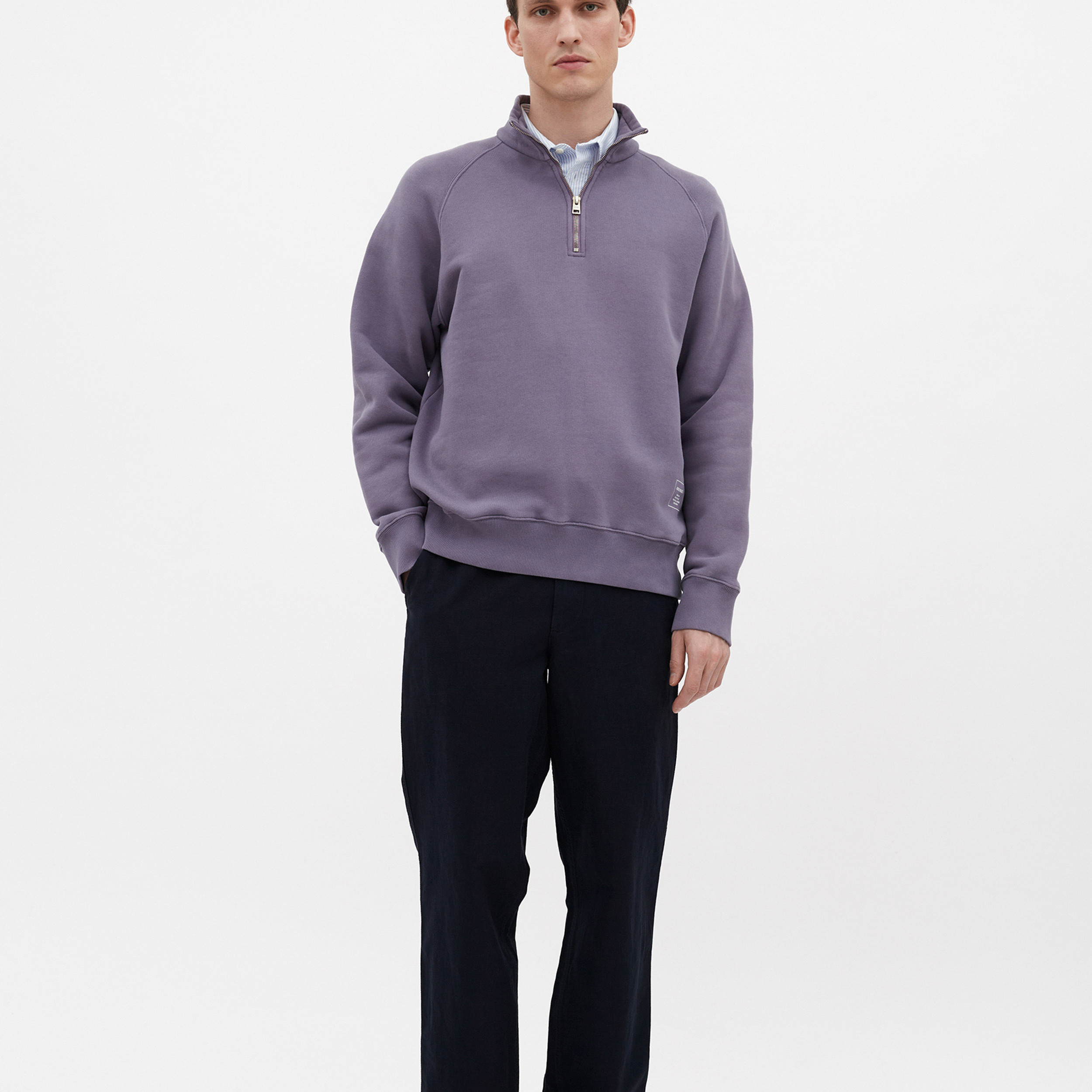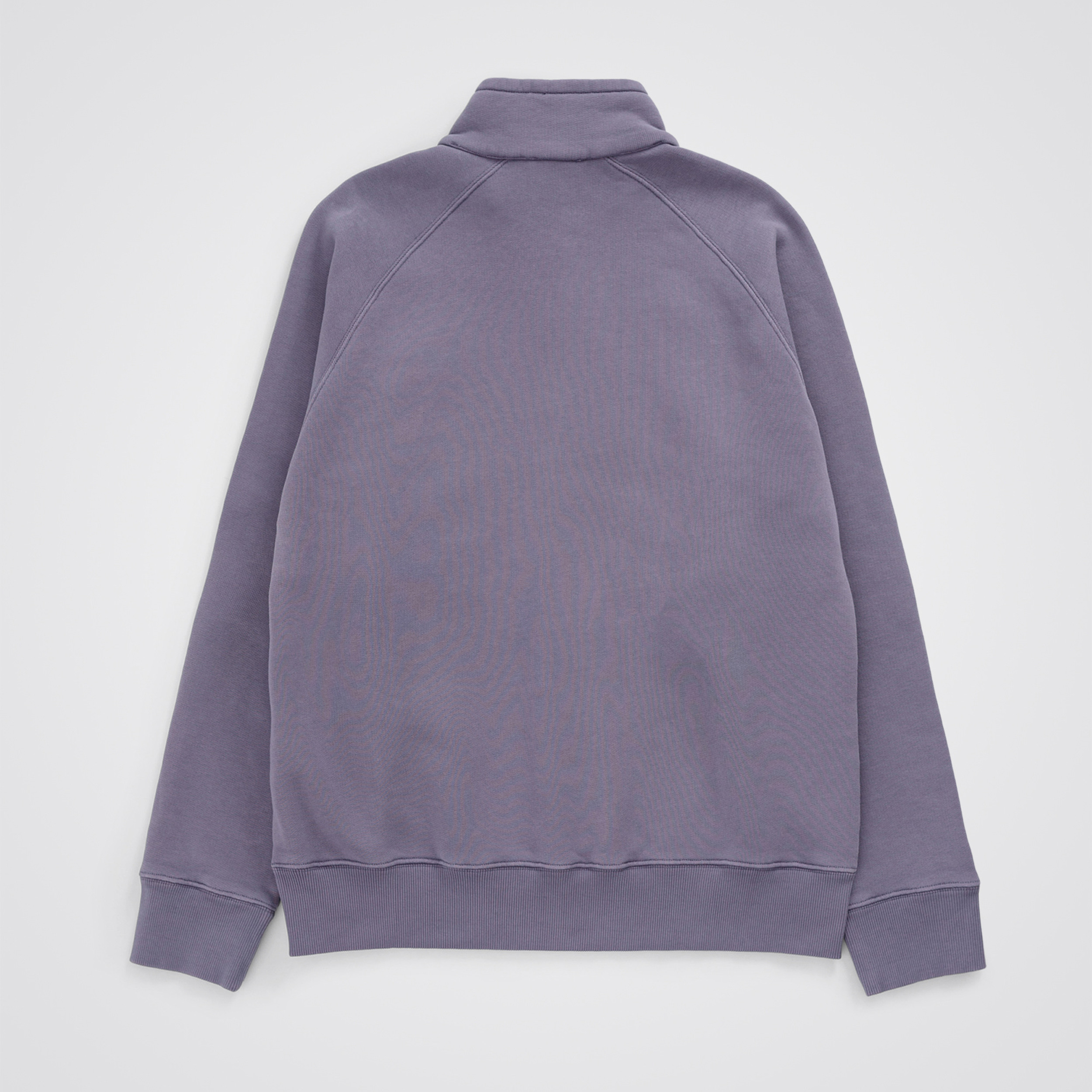 A relaxed fitting half zip sweatshirt constructed in a brushed back sweat quality made of organic cotton featuring raglan sleeves. The style is garment dyed with a screen printed logo print on the front bottom. It is finished with a more tighter rib at cuffs and hem and twin needle stitching details.
