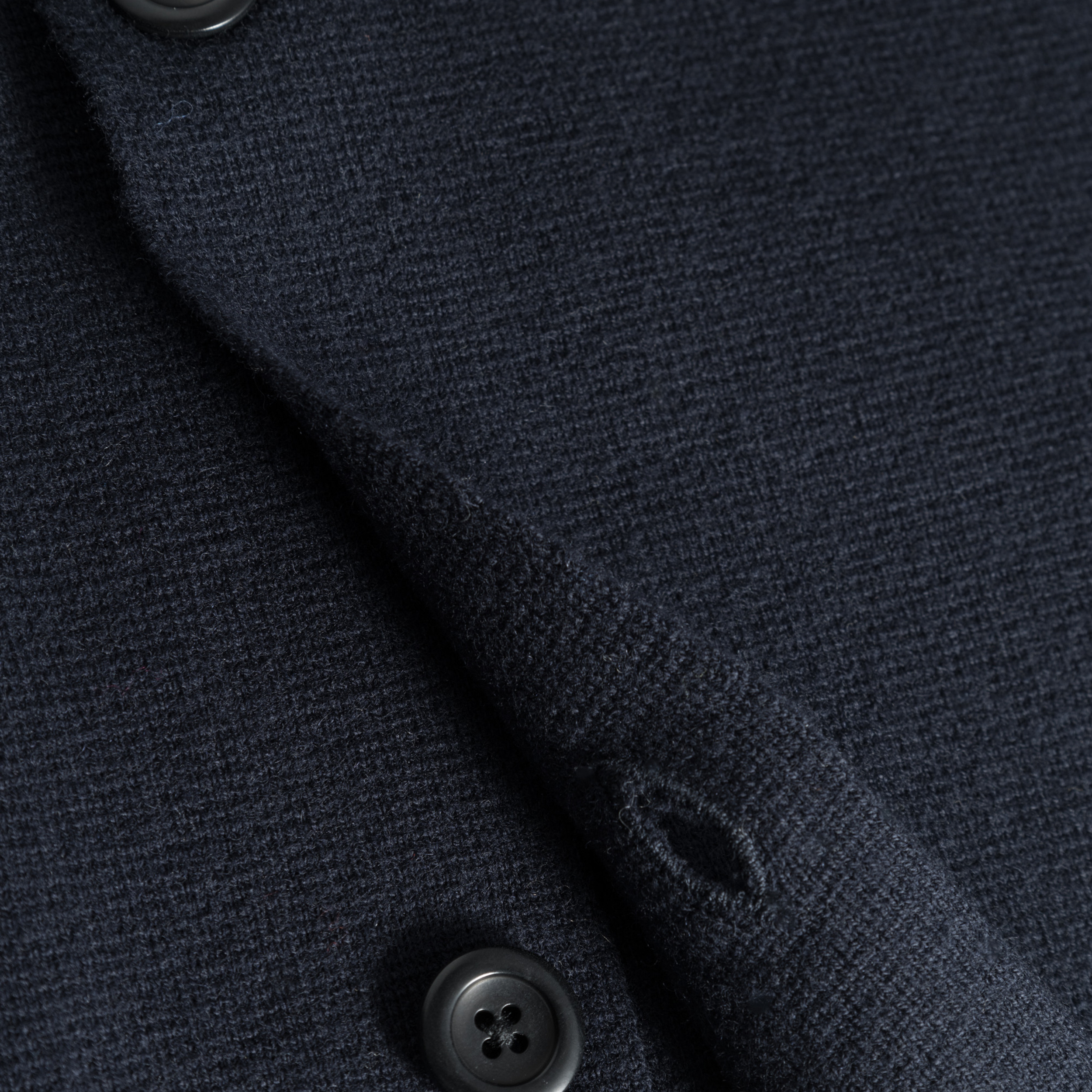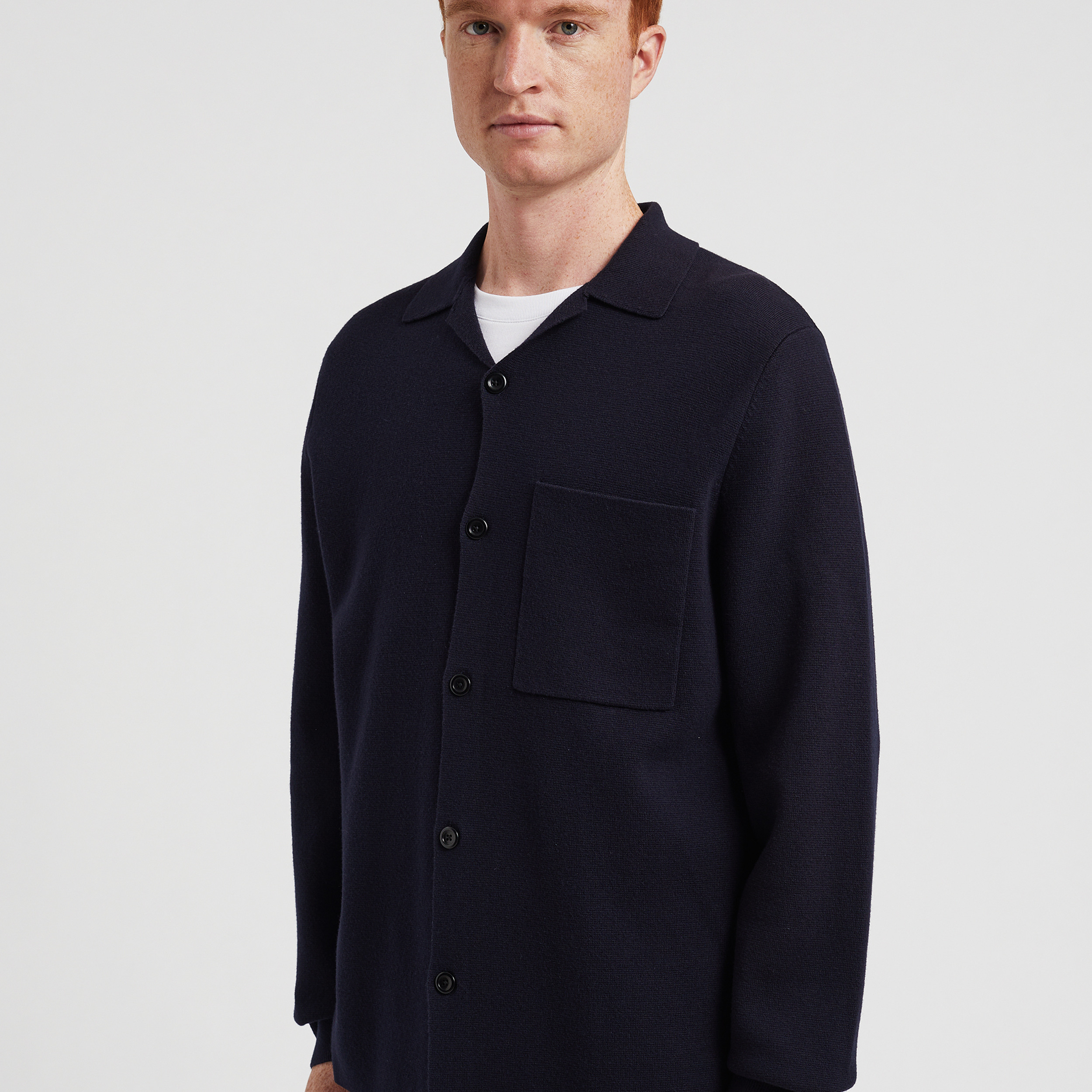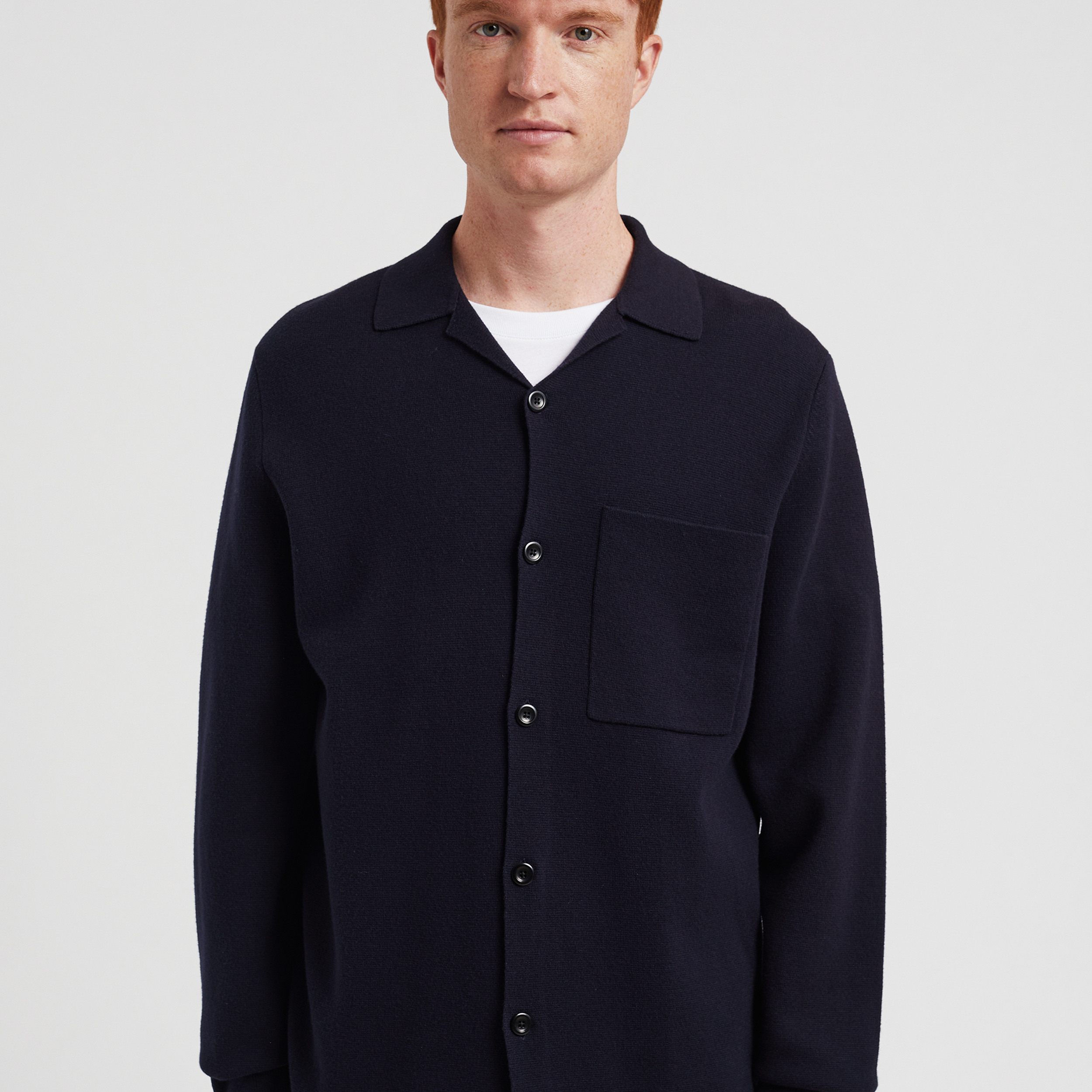 The style is constructed with set-in sleeves and finished with a chest pocket, self-start hem and ribbed cuffs. It features a knitted camp collar and buttons at center front.